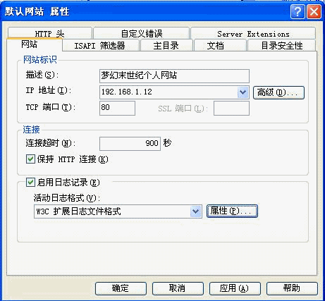 如上圖在網(wǎng)站選項(xiàng)框中可以設(shè)置網(wǎng)站的描述,指定的IP地址,連接超時(shí)的時(shí)間,這些都可以根據(jù)愛(ài)好隨意設(shè)置,重點(diǎn)說(shuō)一下日志紀(jì)錄,一個(gè)好的網(wǎng)管必須養(yǎng)成經(jīng)常觀察日志的習(xí)慣,只有這樣,才能保證計(jì)算機(jī)網(wǎng)絡(luò)的安全性。點(diǎn)擊日志設(shè)置的屬性如下圖: