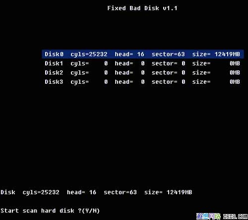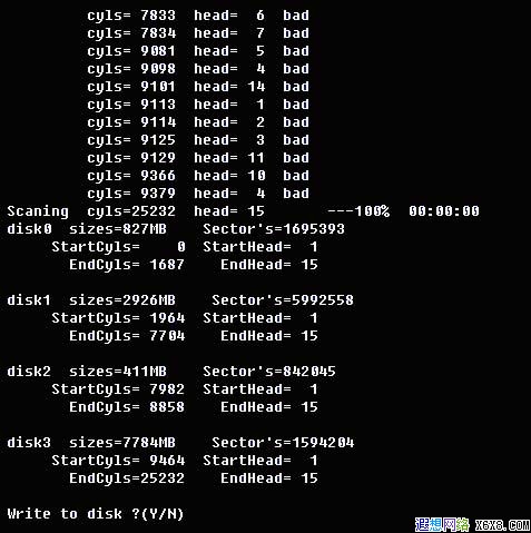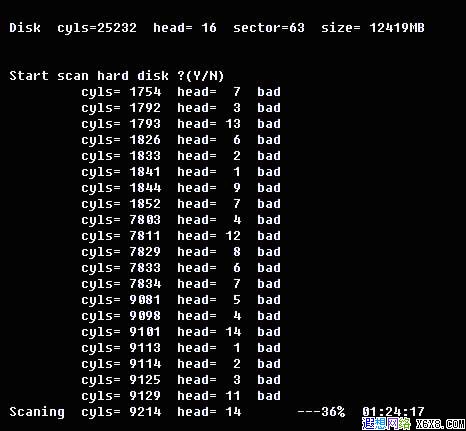 選擇你要修復(fù)的硬盤并按回車確認(rèn)后軟件提示“Start scan hard disk ?(Y/N)”,按Y程序就開(kāi)始對(duì)硬盤進(jìn)行掃描。掃描時(shí)發(fā)現(xiàn)的壞道的位置將會(huì)被一一列出在屏幕上(如圖02所示),而下方則顯示掃描進(jìn)行的百分比以及剩余時(shí)間。