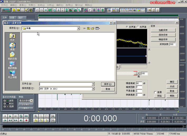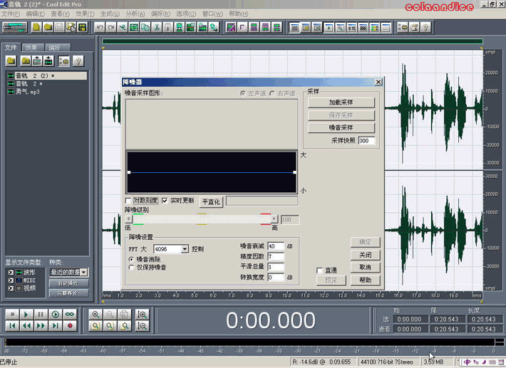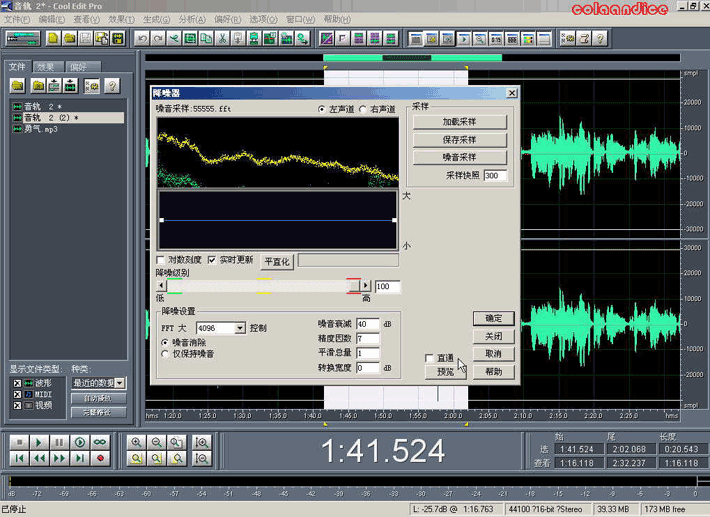 8.回到處于波形編輯界面的人聲文件,打開降噪器,加載之前保存的噪聲采樣進行降噪處理,點確定降噪前,可先點預(yù)覽試聽一下降噪后的效果(如失真太大,說明降噪采樣不合適,需重新采樣或調(diào)整參數(shù),有一點要說明,無論何種方式的降噪都會對原聲有一定的損害) (圖13 圖14 圖15)