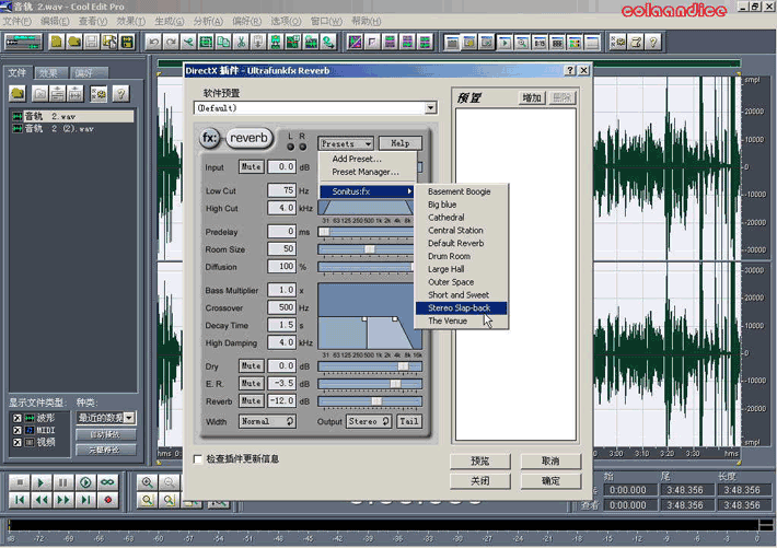 2.加載預(yù)置下拉菜單中的各種效果后(也可手動調(diào)節(jié))點右下方的"預(yù)覽"進行反復(fù)的試聽,直至調(diào)至滿意的混響效果后,點確定對原聲進行混響處理,常用的效果如圖中所示(圖22 圖23)。