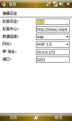 4、下邊的彩信設(shè)定,原則上名字任選,我是常用的MMS,彩信中心名:http//mmsc.monternet.com,數(shù)據(jù)連接是之前設(shè)置的wap,網(wǎng)關(guān)一定要選WAP 1.0(試過用2.0無法發(fā)送彩信),IP地址和端口就照寫就好。