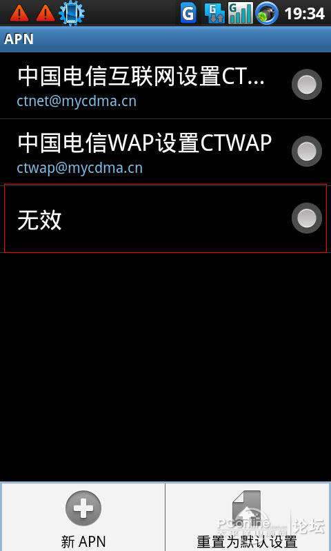 替換完兩個關鍵文件之后,就要設置新的APN,點擊設置--無線和網絡設置--移動網絡--接入點名稱,然后點擊I909屏幕左下方屬性鍵,然后點擊新建APN,然后名稱那里修改為"無效"其他什么都不用再修改,直接保存即可(保存的時候一樣是按I909屏幕左下方屬性鍵,然后點擊保存),然后把點選 "無效"右方的圓點即可,最后再把I909重啟一下;