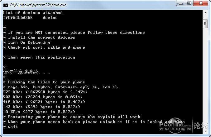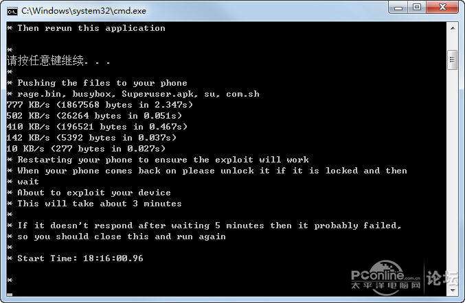 然后此時連接上USB,同時需要先下載一個破解軟件"FascinateRoot_v02"(破解軟件在文章底部下載);解壓后雙擊里面的文件"START_ROOT.bat",會彈出CMD的窗口,按照提示按任何按鍵開始進入獲取Root權限(如下圖);