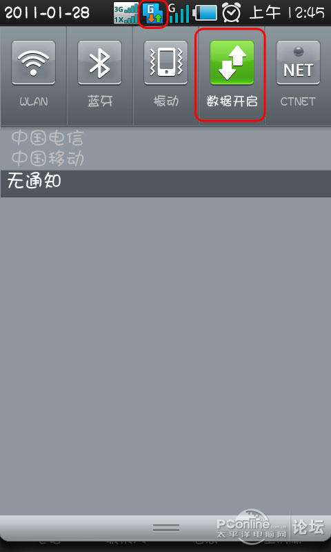 下拉菜單欄,點擊數據開啟,這時屏幕頂端GSM卡信號顯示的圖片旁邊就會出現GSM的上網數據流量標志;此時你就可以用你的GSM卡進行上網了!(暫時由于我手上只有移動的GSM卡和電信的3G卡,證實已經可以用移動的卡上GPRS,至于聯通是否可行,據破解者說是不可以的,不過有聯通卡的童鞋也可以試試)