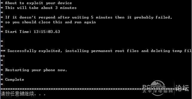 到了Start time這里要等一段比較長的時間,繼續(xù)等,等一會兒就會出現Complete的英文,這時你的I909就已經獲取好Root權限了,然后就會出現按任意鍵繼續(xù)的提示,隨便按就行,然后手機重啟,這時你的I909已經成功獲得Root權限了;
