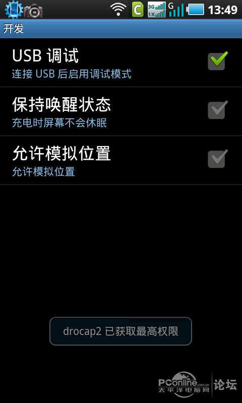 由于I909要破解GPRS上網,需要先獲取Root權限,所以這里也給大家講解下如何讓I909獲取root權限(當然已經獲取過Root權限的童鞋可以跳過此步驟),首先在手機連接USB之前,先進入設置--應用程序--開發(fā),把"USB調試"這一項先勾選上(如下圖);