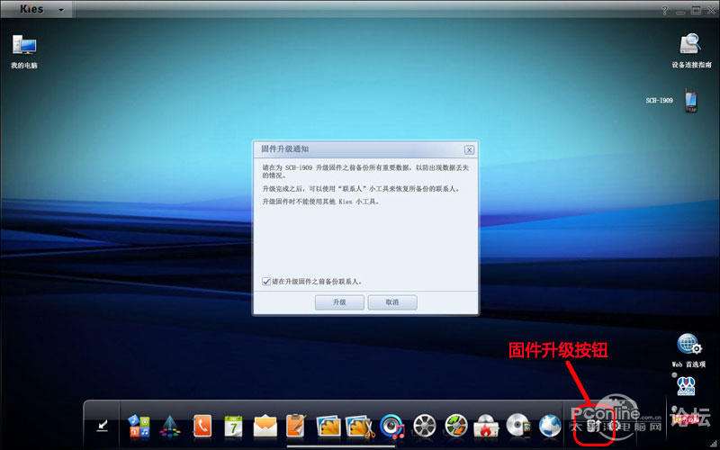 首先去三星官網下載個I909用的Samsung Kies,這是三星手機的PC端連接套件,然后在電腦上安裝好這個套件(套件下載點擊此處即可:點擊下載),安裝好后,用USB線連接上電腦,I909上會讓你選擇USB連接的模式,選"Samsung Kies"即可,然后在電腦上打開Samsung Kies,點擊又下角的固件升級按鈕,然后按照步驟升級即可!