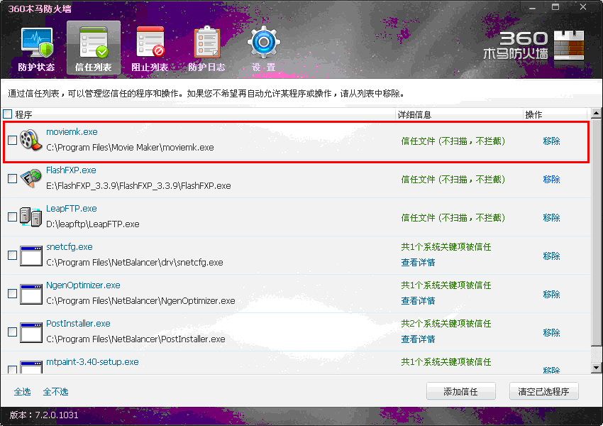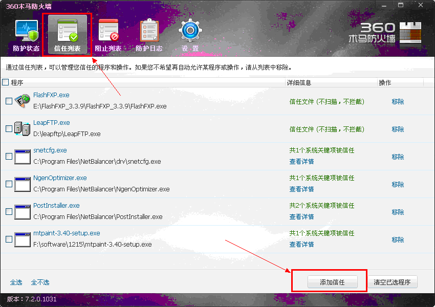 2、在360木馬防火墻窗口中,單擊"信任列表"圖標(biāo),然后單擊下面的"添加信任"按鈕。