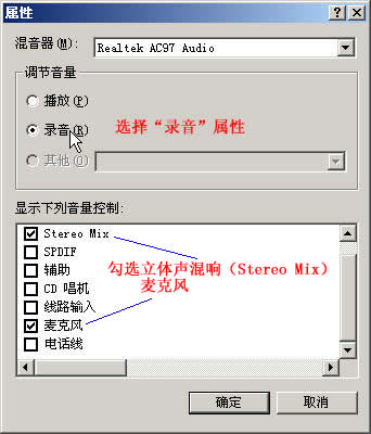 2.在屬性面板里選擇“錄音”屬性,并勾選立體聲混響(stereo mix)、麥克風(fēng)(microphone)