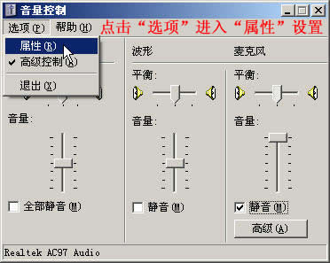 進(jìn)入音量設(shè)置,將音量控制的“屬性”中波形選項(xiàng)的"音量"調(diào)節(jié)到中間以下位置,"音量"調(diào)節(jié)的越低,錄制作品的雜音越小,若發(fā)現(xiàn)調(diào)節(jié)后聲音變小了,只需將"麥克風(fēng)"的音量適當(dāng)提高就可以了