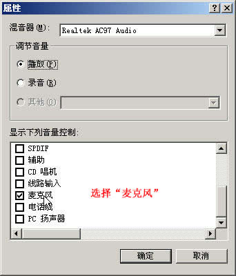 會(huì)彈出如下屬性窗口,選擇“播放”屬性,并選中“音量、波形、麥克風(fēng)(microphone)