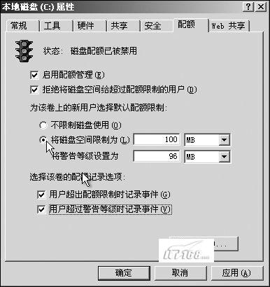 然后在“為該卷上的新用戶選擇默認配額限制”框中選擇“將磁盤空間限制為”單選項,接著在后面的欄中輸入100,磁盤容量單位選擇為“MB”,然后進行警告等級設置,在“將警告等級設置為”欄中輸入“96”, 容量單位也選擇為“MB”,這樣就完成了默認配額設置。此外,還要選中“用戶超出配額限制時記錄事件”和“用戶超過警告等級時記錄事件”復選框,以便將配額告警事件記錄到Windows日志中。
