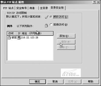 為了保證FTP服務器的安全,還可以拒絕某些IP地址的訪問。在默認FTP站點屬性對話框中,切換到“目錄安全性”標簽頁,選中“授權訪問”單選項(如圖3),然后在“以下所列除外”框中點擊“添加”按鈕,彈出“拒絕以下訪問”對話框,這里可以拒絕單個IP地址或一組IP地址訪問,以單個IP地址為例,選中“單機”選項,然后在“IP地址”欄中輸入該機器的IP地址,最后點擊“確定”按鈕。這樣添加到列表中的IP地址都不能訪問FTP服務器了。