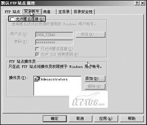 默認情況下,Windows 2000系統(tǒng)的FTP服務器是允許匿名訪問的,雖然匿名訪問為用戶上傳、下載文件提供方便,但卻存在極大的安全隱患。用戶不需要申請合法的賬號,就能訪問FTP服務器,甚至還可以上傳、下載文件,特別對于一些存儲重要資料的FTP服務器,很容易出現泄密的情況,因此建議用戶取消匿名訪問功能。