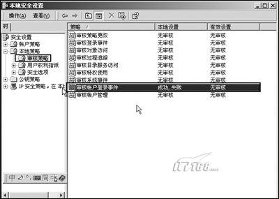 在本地安全設置窗口中,依次展開“安全設置→本地策略→審核策略”,然后在右側的框體中找到“審核賬戶登錄事件”項目(如圖4),雙擊打開該項目,在設置對話框中選中“成功”和“失敗”這兩項,最后點擊“確定”按鈕。該策略生效后,FTP用戶的每次登錄都會被記錄到日志中。