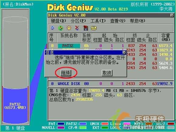 在這里恢復(fù)類似硬盤數(shù)據(jù),筆者強(qiáng)烈推薦您使用國(guó)產(chǎn)軟件Disk Genius(DiskMan)。它具有強(qiáng)大的分區(qū)表重建功能,能恢復(fù)被破壞的分區(qū)表。首先用軟盤引導(dǎo)計(jì)算機(jī),然后在DOS系統(tǒng)下啟動(dòng)Disk Genius,打開Disk Genius后也會(huì)看到只有一個(gè)分區(qū)。這時(shí)選擇“工具”菜單,然后選擇“重建分區(qū)表”命令。在彈出的對(duì)話框中單擊“繼續(xù)”按鈕。