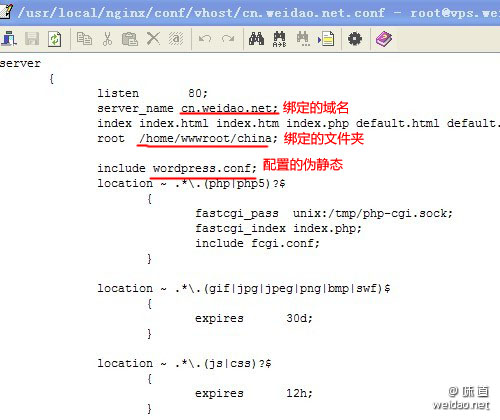 已經(jīng)綁定域名列表 /usr/local/nginx/conf/vhost/ 里面有一個(gè)文件 cn.weidao.net.conf ,說(shuō)明cn.weidao.net 已經(jīng)綁定好了,雙擊打開確保添加域名時(shí)配置正確。