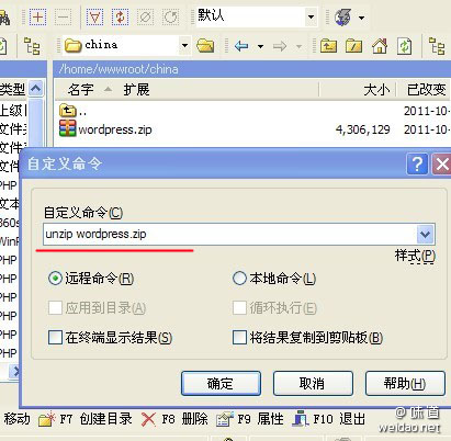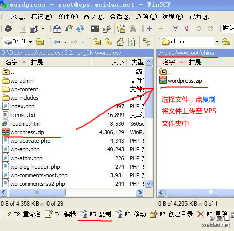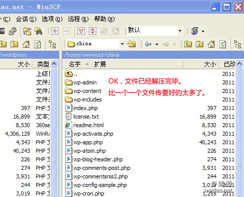 4.3.1,下載好 wordpress3.2.1 后,本地解壓下,將 wordpress 文件夾下所有的文件用 ZIP 格式打包為 wordpress.zip ,然后用 WinSCP 上傳至 VPS域名綁定的文件夾china里面, 如圖所示: