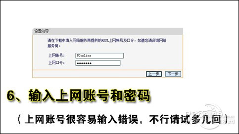 輸入從網(wǎng)絡(luò)服務(wù)商申請(qǐng)到的賬號(hào)和密碼,輸入完成后直接下一步。