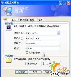 完成了客戶端軟件的安裝后,運行“遠(yuǎn)程桌面連接”程序(圖4),在“計算機(jī)”欄中填寫終端服務(wù)器的IP地址,如“192.168.0.1”,在“用戶名”和“密碼”欄中填寫用戶名和密碼(注意:這里填寫的是在Windows Server 2003服務(wù)器上局域網(wǎng)管理員為你設(shè)置的賬號,并不是本地客戶機(jī)的用戶名和密碼),然后點擊“連接”按鈕,就可以遠(yuǎn)程登錄終端服務(wù)器了。