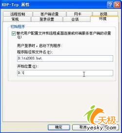 把“ts2003.BAT”設(shè)置成用戶的登錄腳本。在終端服務(wù)器上,進(jìn)入“RDP-Tcp屬性”窗口,并切換到“環(huán)境”框(圖7),勾選“替代用戶配置文件和遠(yuǎn)程桌面連接或終端服務(wù)客戶端的設(shè)置”,在“程序路徑和文件名”欄中輸入“D:\ts2003.bat”,在“開始位置”欄中輸入“D:\”,點擊“確定”即可完成設(shè)置。此時,我們就可通過終端服務(wù)日志了解到每個用戶的行蹤了。