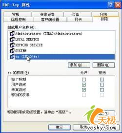 首先,我們新建一個用戶組“ts”,將所有要訪問終端服務(wù)器的局域網(wǎng)用戶都添如到“ts”組中。在服務(wù)器端,點擊“開始→程序→管理工具→終端服務(wù)配置”,在終端服務(wù)配置窗口左欄中點擊“終端服務(wù)配置→連接”,進(jìn)入“RDP-Tcp屬性”框,再進(jìn)入“權(quán)限”框(圖5),點擊“添加”按鈕,進(jìn)入“選擇用戶組或用戶”窗體,點擊下方的“高級”,然后點擊“立即查找”,找到“ts”用戶組,點擊“確定”。