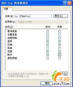 在終端服務(wù)器上的“權(quán)限”框中點擊“高級”按鈕,進(jìn)入“審核”框,再點擊“添加”,在“選擇用戶和組”列表框中選擇“ts”,并點擊“確定”,彈出“RDP-Tcp的審核項目”對話框(圖6),在框中勾選想審核的項目后,點擊“確定”即可。