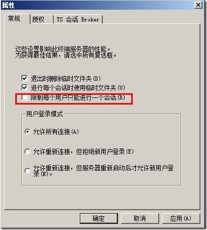 終端服務器授權模式:點右鍵,屬性。常規(guī),限制每個用戶只能使用一個會話,去掉勾,應用,確定。到這里就可以多登錄了。如果沒有設置生效,重啟一下。