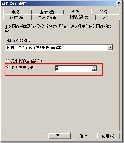 連接:RDP-tcp 點右鍵,屬性。網(wǎng)絡適配器-最大連接數(shù)2。默認情況下如果你不添加終端服務功能,最大只能調整為同時2個連接。想設多少自己填