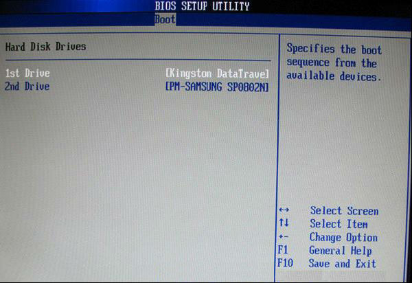 上圖3-2 硬盤驅(qū)動器“Hard Disk Drives”選擇:選擇U盤為第一啟動設(shè)備“1st Drive”。如果先在“Hard Disk Drives”里面選擇U盤為第一啟動設(shè)備,如圖3-2所示,那么這里就會顯示有U盤,那就選擇U盤為第一啟動設(shè)備,如圖4-2所示。