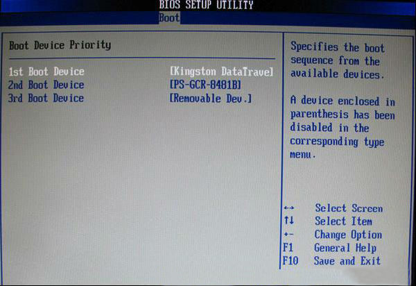 上圖4-2 :當我們首先在圖3的硬盤驅(qū)動器“Hard Disk Drives”中選擇U盤為第一啟動設(shè)備“1st Drive”以后,啟動優(yōu)先級設(shè)備選擇(Boot Device Priority)里面才會顯示U盤,然后我們優(yōu)先選擇U盤作為第一啟動設(shè)備(1st Boot Device)