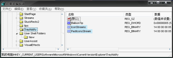 1.“開(kāi)始→運(yùn)行”中鍵入regedit,打開(kāi)注冊(cè)表編輯器,展開(kāi)“HK**_CURRENT_USER\Software\Microsoft\Windows\Curr entVersion\Explorer\TrayNotify”分支,其中“IconStreams”和“PastIconStream”項(xiàng)中分別存儲(chǔ)著“當(dāng)前項(xiàng)目”和“過(guò)去的項(xiàng)目”,將“TrayNotify”項(xiàng)刪除。