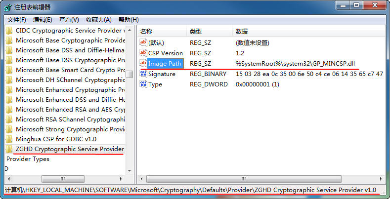 HKEY_LOCAL_MACHINE/SOFTWARE/Microsoft/Cryptography/Defaults/Provider/Minghua CSP for GDBC v1.0