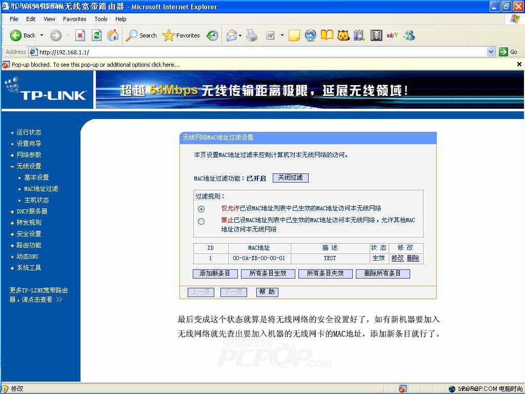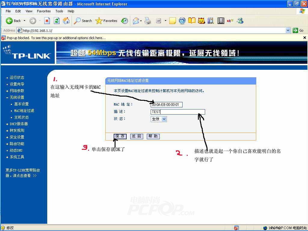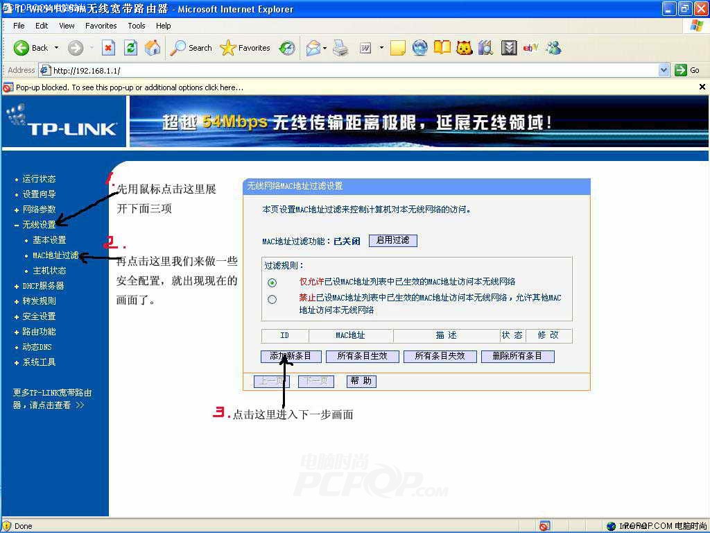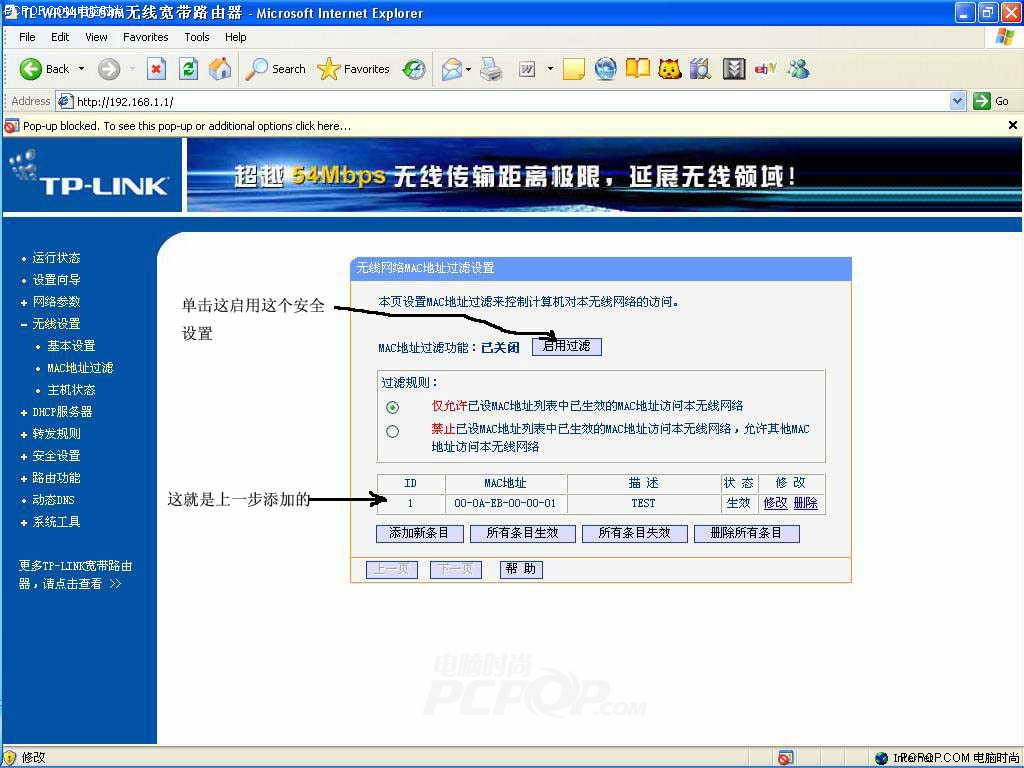 而 MAC地址(MAC地址是每一塊網(wǎng)卡在全球唯一的編碼)過濾功能可以使具有某些MAC地址的電腦無法訪問本無線網(wǎng)絡(luò)或只使具有這些MAC地址的電腦訪問本 無線網(wǎng)絡(luò)。而像我們這次的情況是就只有一臺電腦要加入所以用MAC地址過濾比較適合,同時(shí)安全性也會非常強(qiáng)外部的無線設(shè)備將無法進(jìn)入我們的無線網(wǎng)絡(luò)了,所 以只要在無線寬帶路由器端添加一個(gè)MAC地址就行了,那么我們就按下面圖中的步驟來做: