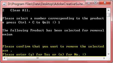 這里要選擇你需要的卸載模式,如果卸載Adobe CS3/CS4的軟件,則輸入數(shù)字1,然后回車;要卸載Adobe CS5/CS5.5,則輸入數(shù)字2并回車,要卸載Adobe Flash Player,則輸入數(shù)字3并回車。