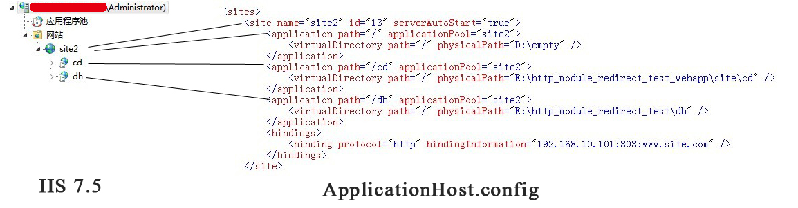 而在IIS7或以上(但目前我能接觸到的最高版本的IIS就是win7中的IIS7.5),site,application和virtual directory的概念已經(jīng)被規(guī)范起來,已經(jīng)不像IIS6那樣含糊。在IIS7+中,他們是獨立的概念,并且在IIS組織架構(gòu)上呈現(xiàn)出一種層次關(guān)系:一個site中可以有一個或者多個application,一個application中可以有一個或者多個virtual directory,而一個virtual directory則對應(yīng)著一個物理路徑。一個site默認(rèn)會至少有一個application,稱為根應(yīng)用程序(root application)或者默認(rèn)應(yīng)用程序(default application),而一個application至少有一個vitual director,稱為根虛擬目錄(root virtual directory)來看一下我的IIS7.5上一個site的結(jié)構(gòu)和這個site在IIS的ApplicationHost.config文件是怎樣對應(yīng)的。: