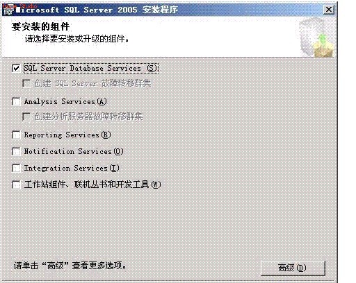 接下來輸入注冊信息;選擇要安裝的組件,這里我們只選擇SQL Server Database Services組件,其他的用不著。在這個過程中我們可以點擊"高級"按鈕來選擇安裝路徑。