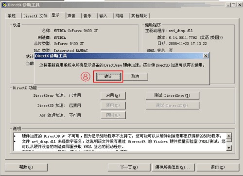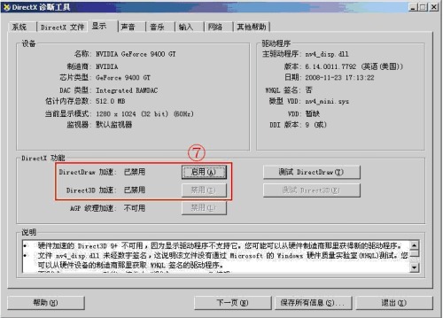 第七步:點擊上方的“顯示”選項卡后,您可看到DirectDraw 和 Direct3D的狀態(tài)。如果為“已禁用”,則點擊旁邊的“啟動”,以開啟顯卡的D3D加速功能。
