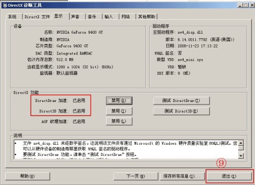 第九步:此時您的D3D加速顯示“已啟用”。點擊右下角的“退出”按鈕后,您就可以正常的進行游戲了。