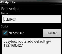 再打開安裝好的GScript軟件,按菜單鍵進(jìn)入“Add script”(新建腳本),在上面的輸入框隨便填個(gè)名字(比如usb聯(lián)網(wǎng)),下面的輸入框則需要輸入后面的腳本代碼:busybox route add default gw 192.168.42.1 (注意不能輸錯(cuò)哦)!完成后選擇“save”保存,然后按返回鍵回到軟件主界面選擇“usb聯(lián)網(wǎng)”腳本執(zhí)行就行了。如果不出意外現(xiàn)在你的手機(jī)就已經(jīng)可以連接電腦的寬帶網(wǎng)絡(luò)進(jìn)行共享上網(wǎng)啦