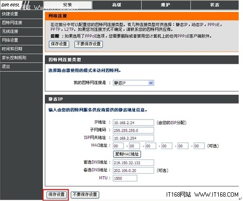 此步驟主要是設置用戶當前的上網類型,一般分為PPPoE、動態(tài)IP、靜態(tài)IP、PPTP、L2TP等。家庭用戶大多數(shù)使用的是ADSL或者是小區(qū)寬帶對應的是PPPoE。因為我是在公司里做的實驗,我們公司使用的是靜態(tài)IP方式上網。用戶在此不用過多擔心自己使用的到底是哪種上網方式,因為智能的路由器會自動偵測用戶的上網類型,如下圖所示: