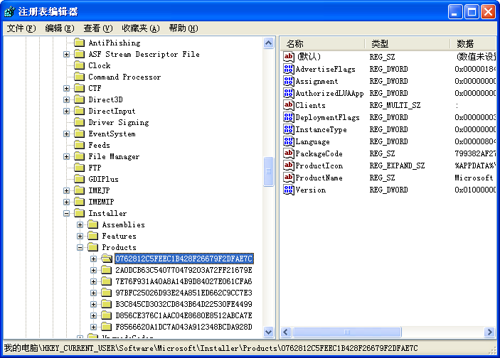 開始--運(yùn)行--regedit回車--依次找到HKEY_CURRENT_USER\Software\Microsoft\Installer\Products\0762812C5FEEC1B428F26679F2DFAE7C---刪除0762812C5FEEC1B428F26679F2DFAE7C,相信我的話你不用備份。