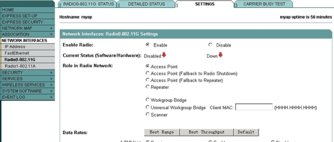 打開設備的無線功能,直接到NETWORK INTERFACE-Radio0-802.11G,Enable Radio啟用此協(xié)議標準。