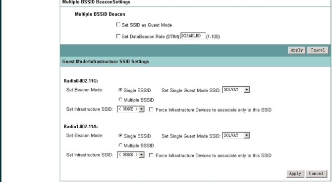 最后到Guest Mode/Infrastructure SSID Settings中,Radio-802.11G和Radio-802.11A,分別設置Set Single Guest Mode SSID:選擇創(chuàng)建的SSID,Apply。