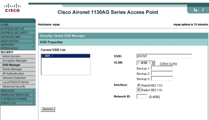 創(chuàng)建SSID:定位到SSID Manager,點擊NEW新建一個SSID。在SSID后面輸入SSID名稱,Interface選擇Radio0-802.11G和Radio0-802.11A。