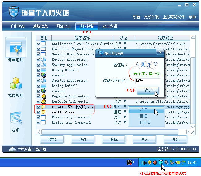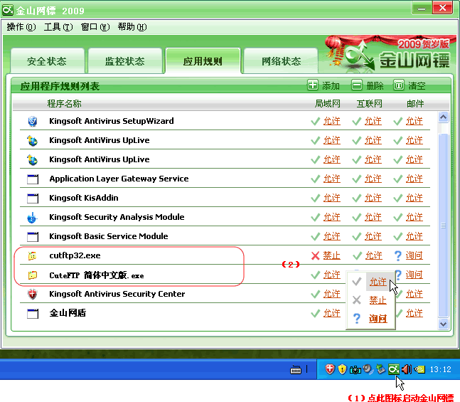 C.江民防火墻 如果你電腦裝的是江民防火墻,當(dāng)彈出以下窗口時(shí),按下圖(1)、(2)步操作。