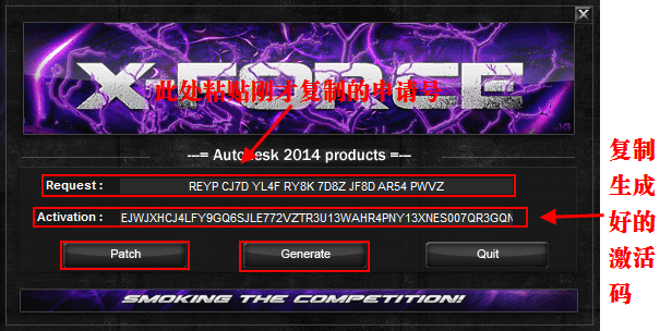 下圖中,使用Ctrl+V 粘貼申請(qǐng)?zhí)?;粘貼完成以后,先選擇“Patch”選項(xiàng),然后再選擇“Generate”生成激活碼