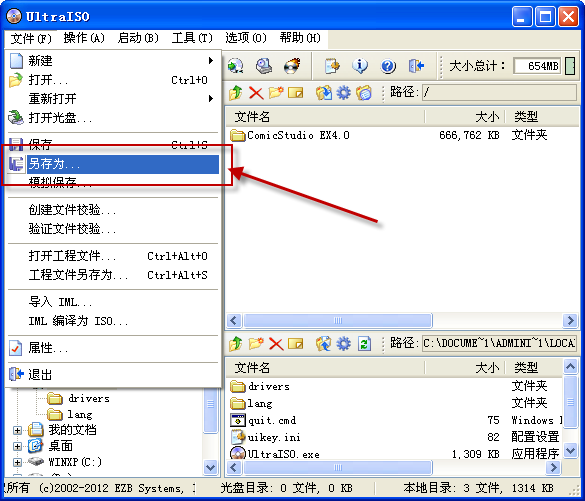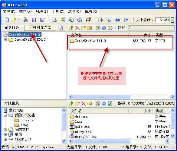 然后呢,又只有把解壓的文件夾自己制作成iso鏡像,使用的是UltraISO PE(軟碟通),方法很簡單,打開ULTRAISO.EXE后,把ComicStudio EX4.0整個文件夾拖入到UltraISO界面中即可,如下圖。