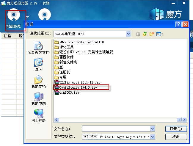 6、使用虛擬光驅加載鏡像吧,加載鏡像->打開鏡像文件所在目錄,選定ComicStudio EX4.0.iso鏡像文件。使用西西制作好的鏡像文件吧,上面5步幫你省略了。
