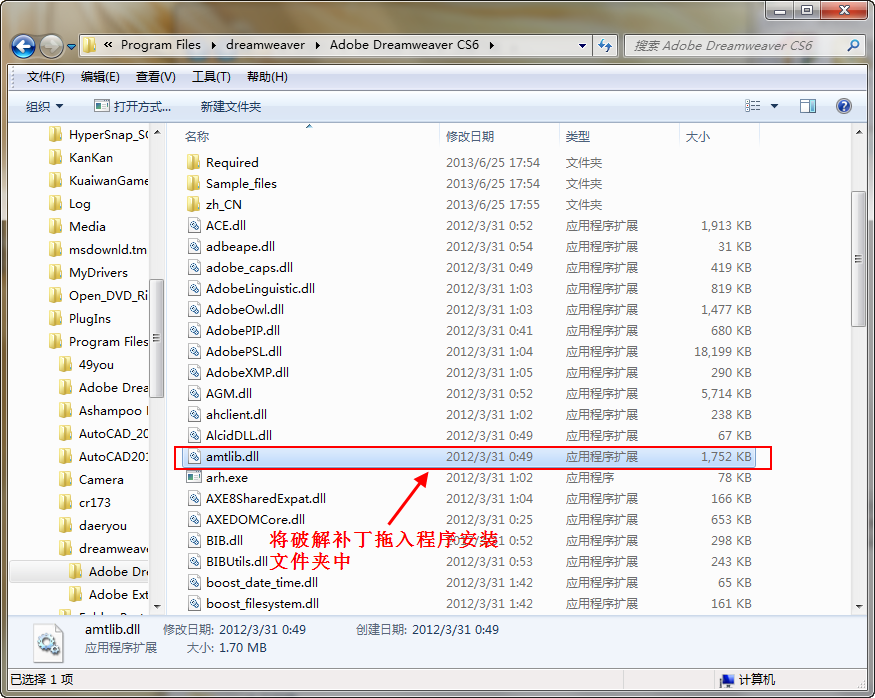 打開Dreamweaver cs6安裝文件夾,將適合自己系統(tǒng)的破解補(bǔ)丁文件夾中的文件拖入程序安裝文件夾中覆蓋同名文件